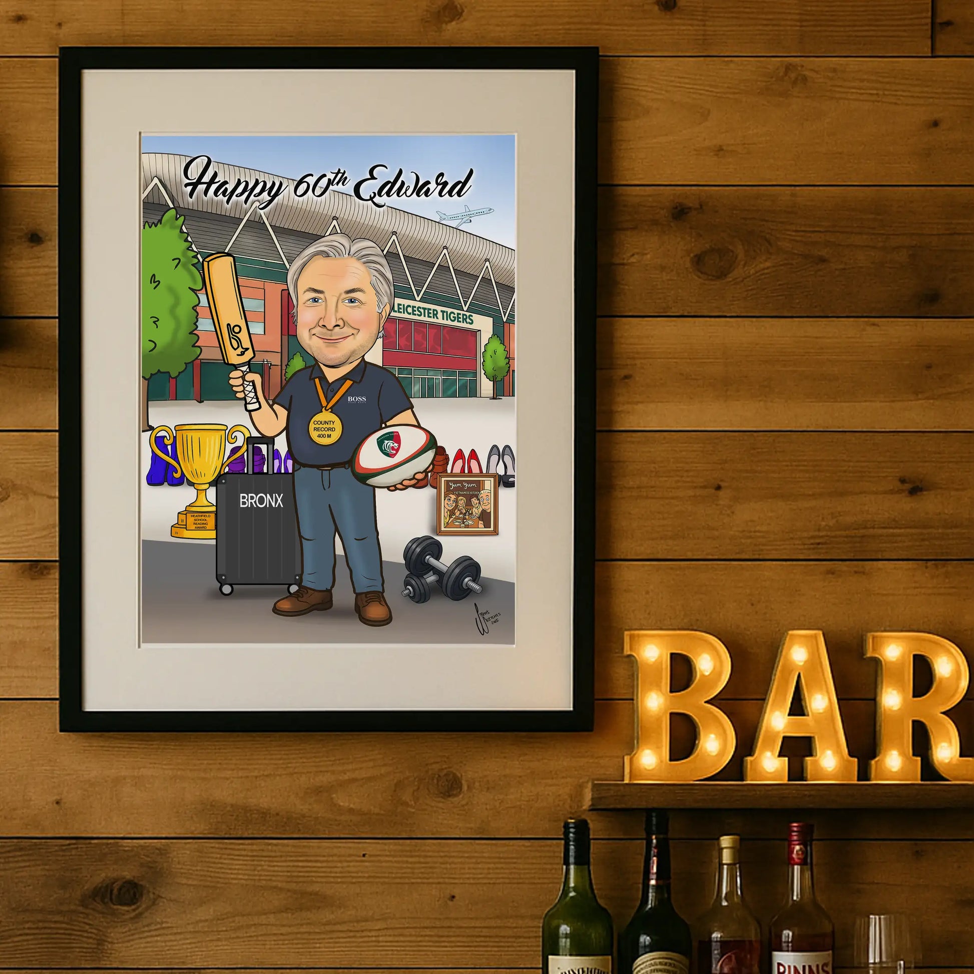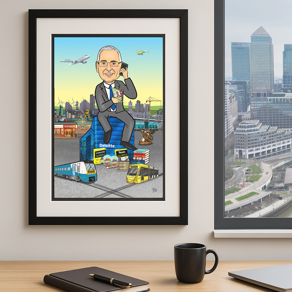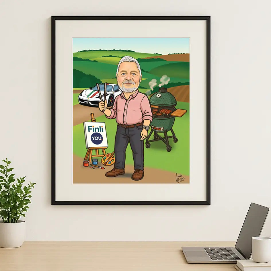 Fully custom, hand-drawn caricature portraits that celebrate their career, passions, personality, family and life. Framed and ready to gift